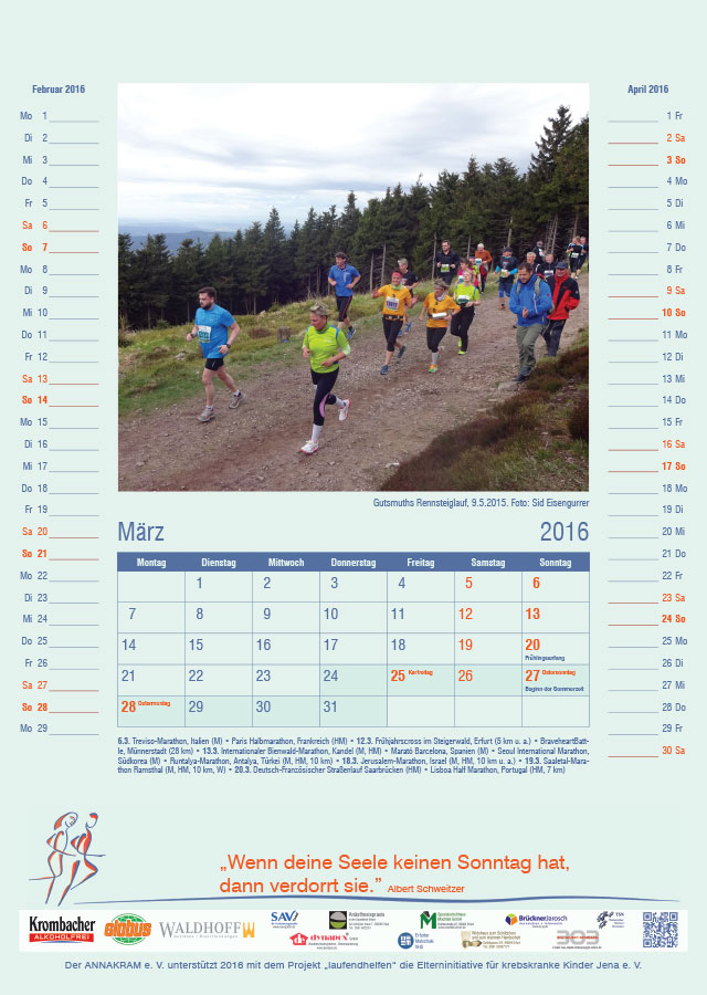ANNA's Laufkalender 2016 ANNA's Laufkalender 201621.11.2015, Erfurt, SAV Magdeburger Allee Auch im 2016 wird es wieder einen Laufkalender des Annakram e. V. geben. Die Fotos sind während unserer Laufeinsätze im zurückliegenden Jahr entstanden. Die Kamera war stets mit am Start. Kunst und Sport gehören nun mal zusammen. Für uns zumindest. Vor allem jedoch wollen wir damit wieder auf unsere Spendenaktion „laufendhelfen“ aufmerksam machen. 2016 werden wir für die „Elterninitiative für krebskranke Kinder Jena e. V.“ auf Strecke gehen. Das heißt für jeden Kilometer, den die Mitglieder unserer Laufmeute bei Volksläufen u. ä. bewältigen, zahlen sie 10 Cents in die Spendenkasse. Dazu kommen die Erlöse vom Erfurt Marathon 3, der am 27. August 2016 stattfindet, und weitere Spenden. Übrigens die 1.000 Euro haben wir bald zusammen. Und das Jahr hat noch nicht einmal begonnen. PS: Beim Erfurter Silvesterlauf werden auch ANNAs Laufenthusiasten wieder ein paar Runden drehen. Und natürlich haben wir ein großes Paket Laufkalender auf Tasche. Für eine kleine Spende ist der dann zu haben. Hier schon mal ein Einblick.