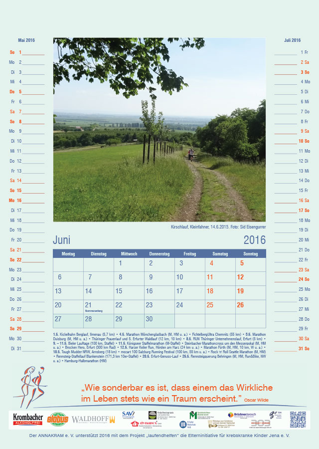 ANNA's Laufkalender 2016 ANNA's Laufkalender 201621.11.2015, Erfurt, SAV Magdeburger Allee Auch im 2016 wird es wieder einen Laufkalender des Annakram e. V. geben. Die Fotos sind während unserer Laufeinsätze im zurückliegenden Jahr entstanden. Die Kamera war stets mit am Start. Kunst und Sport gehören nun mal zusammen. Für uns zumindest. Vor allem jedoch wollen wir damit wieder auf unsere Spendenaktion „laufendhelfen“ aufmerksam machen. 2016 werden wir für die „Elterninitiative für krebskranke Kinder Jena e. V.“ auf Strecke gehen. Das heißt für jeden Kilometer, den die Mitglieder unserer Laufmeute bei Volksläufen u. ä. bewältigen, zahlen sie 10 Cents in die Spendenkasse. Dazu kommen die Erlöse vom Erfurt Marathon 3, der am 27. August 2016 stattfindet, und weitere Spenden. Übrigens die 1.000 Euro haben wir bald zusammen. Und das Jahr hat noch nicht einmal begonnen. PS: Beim Erfurter Silvesterlauf werden auch ANNAs Laufenthusiasten wieder ein paar Runden drehen. Und natürlich haben wir ein großes Paket Laufkalender auf Tasche. Für eine kleine Spende ist der dann zu haben. Hier schon mal ein Einblick.