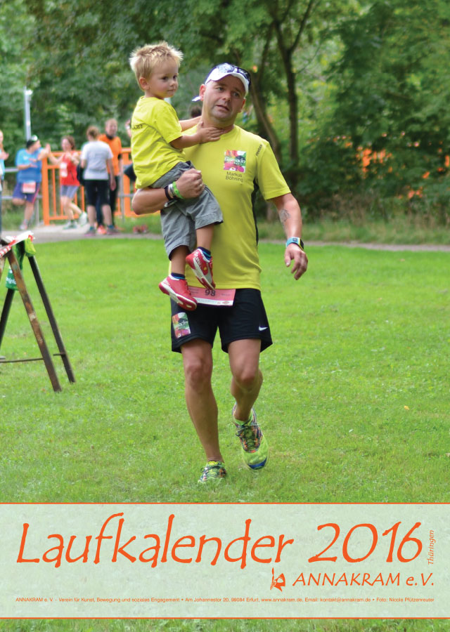ANNA's Laufkalender 2016 ANNA's Laufkalender 201621.11.2015, Erfurt, SAV Magdeburger Allee Auch im 2016 wird es wieder einen Laufkalender des Annakram e. V. geben. Die Fotos sind während unserer Laufeinsätze im zurückliegenden Jahr entstanden. Die Kamera war stets mit am Start. Kunst und Sport gehören nun mal zusammen. Für uns zumindest. Vor allem jedoch wollen wir damit wieder auf unsere Spendenaktion „laufendhelfen“ aufmerksam machen. 2016 werden wir für die „Elterninitiative für krebskranke Kinder Jena e. V.“ auf Strecke gehen. Das heißt für jeden Kilometer, den die Mitglieder unserer Laufmeute bei Volksläufen u. ä. bewältigen, zahlen sie 10 Cents in die Spendenkasse. Dazu kommen die Erlöse vom Erfurt Marathon 3, der am 27. August 2016 stattfindet, und weitere Spenden. Übrigens die 1.000 Euro haben wir bald zusammen. Und das Jahr hat noch nicht einmal begonnen. PS: Beim Erfurter Silvesterlauf werden auch ANNAs Laufenthusiasten wieder ein paar Runden drehen. Und natürlich haben wir ein großes Paket Laufkalender auf Tasche. Für eine kleine Spende ist der dann zu haben. Hier schon mal ein Einblick.