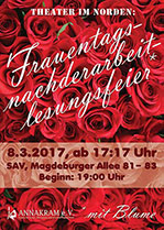 Theater im Norden: Frauentagsnachderarbeitlesungsfeier8.3.2017, Erfurt, Saal der SAV GmbH Auch in diesem Jahr lud die ANNA anlässlich des Internationalen Frauentags zu einer gemütlichen Veranstaltung mit Lesung und Livemusik ein. Wieder fand diese im kleineren Saal des SAV, Magdeburger Allee 81-83, statt. Die weiblichen Gäste bekamen im Laufe des Abends eine frische Rose, und auch für Speis' und Trank war reichlich gesorgt. Alles beim Alten könnte man meinen - doch nicht ganz: Dieses Mal lasen die Männer. Sid Eisengurrer, Sven Wachsmuth und Marcel Wich stellten die Autorinnen Anaïs Nin, Nina Hagen, Helen Fielding und Bonnie Parker vor und lasen abwechselnd ausgewählte Auszüge aus ihren Büchern. Dazwischen gab es auch einige Zitate und Gedichte, unter anderem „Schöne Fraun mit schönen Katzen“ von Joachim Ringelnatz. Musikalisch untermalt wurde das Ganze durch den Erfurter Folk-Musiker Benjamin Bruder auf der Gitarre. Im Anschluss an die Lesung gab er allen Anwesenden noch ein exklusives Konzert. Schön wars! |
