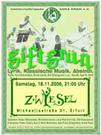 „Giftgrün – Lyrik, Moderne Musik, Absinth“18.11.2006, Erfurt, Zwiesel Giftgrün ist giftgrün ist giftgrün? Weit gefehlt. Wer die Theatergruppe der „kleinkunstbrigade“ kennt, weiß, dass sie so gut wie nie ein Stück unbearbeitet wiederholen. Natürlich bekam auch ihr jüngstes Programm einen frischen Anstrich. Neben neuen Kompositionen von Axel D. Wolf waren auch unveröffentlichte Texte von Sid Eisengurrer zu hören. Zudem bewies Lena Kleinschmidt, die zum ersten Mal mit der „kleinkunstbrigade“ spielte, ihr komödiantisches Talent. Ansonsten blieb alles beim Alten. Das Publikum vergnügte sich auf Kosten der Künstler, die es ihnen mehr als gönnten. Zum Schluss gab`s Applaus und was zu naschen. Sprecher: Lex Musica: PS: Vielen Dank an Lars Schirmer & den Team des Zwiesels und all den unsichtbaren Helfern.