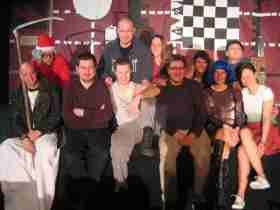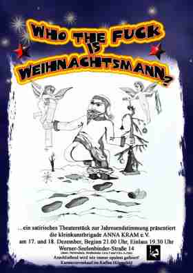 Theaterstück „Who the fuck is Weihnachtsmann“17. - 18. Dezember 2004, Erfurt, Werner-Seelenbinder-Straße 14 Dem Weihnachtsgeist galt diesmal das Interesse der „kleinkunstbrigade“. An zwei Tagen bzw. zwei Abendveranstaltungen versuchte ANNAs Theatermeute, die drändende Frage: „Who the fuck is Weihnachtsmann?“ zu klären. Dazu hatten sie in der Woche vor dem heiligen Fest die Kantine der ehemaligen SED-Parteischule besetzt. Von Altlasten war nichts zu spüren, die Deko-Kleinkünstler um Andreas Jäckel und Thilo Soworka hatten auch diesen Raum zu etwas Besonderen umgestaltet. Obwohl alle mit Eifer und Elan die Vorgaben umsetzten und das Publikum die Umsetzung mit Freude annahm, blieb die Beantwortung der zentralen Fragestellung: „Who the fuck is Weihnachtsmann?“ offen. Da müssen wir wohl noch einmal ran. Mitwirkende: Steffen Neumann, Claudia Geyer, Sven Hoffmann, Texte: Sid Eisengurrer Musik: Guido Graichen Bühnenbild, Ton, Grafik: Andreas Jäckel, Thilo Soworka Maske: Sandra Zöller, Denise Bormann Who the fuck is Weihnachtsmann? Menschen drängen in den Gassen. Ja, mitten in der Narrenzeit O Mist! Ich habe ein Geschenk vergessen. Menschen finden ihr Gewissen. Ja... Menschen singen Friedenslieder. Ja... |
